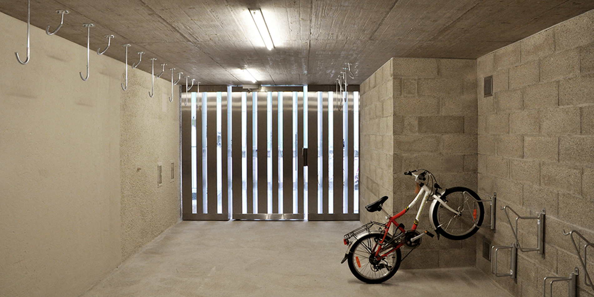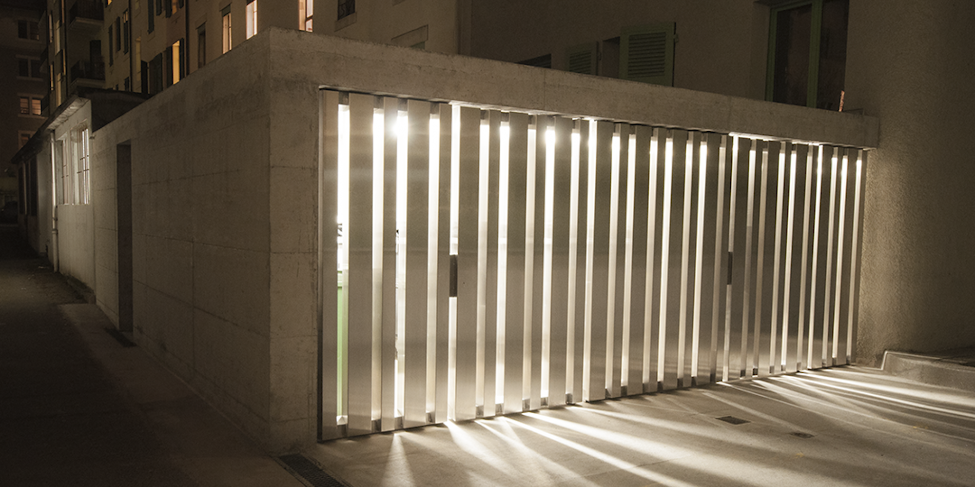 Le projet consiste en un volume en béton brut fermé d’un côté par une claire-voie métallique, dont les poignées et serrures sont habilement intégrées à la construction. De par l’éclairage, la façade offre un jeu d’ombres et de lumières au rythme des usages des habitants.