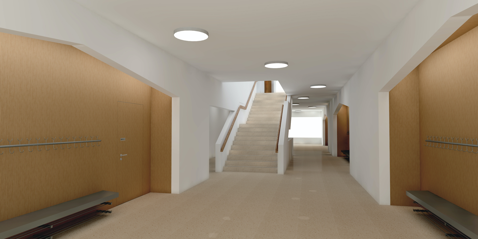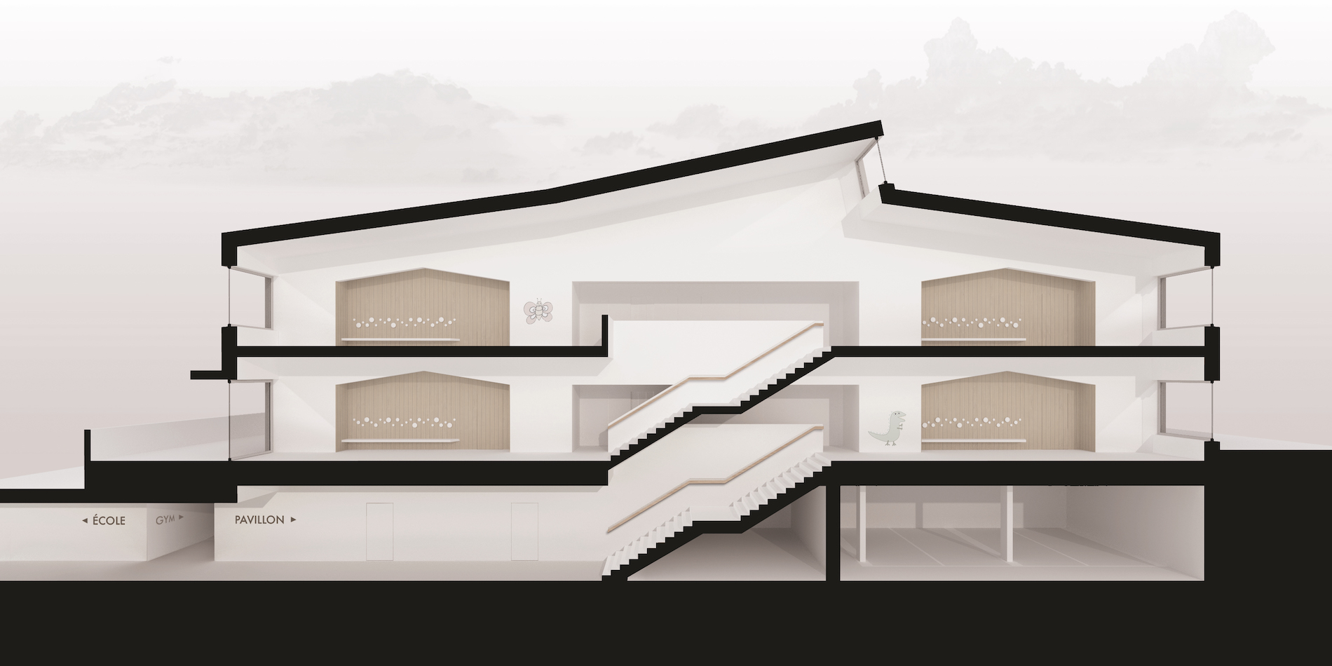 Agrandissement de l’école primaire de Chêne-Bougeries. Le projet consiste en la réinterprétation des espaces de circulation. Le couloir est traité comme une rue intérieure où chaque «maison d’étude» se donne à voir.