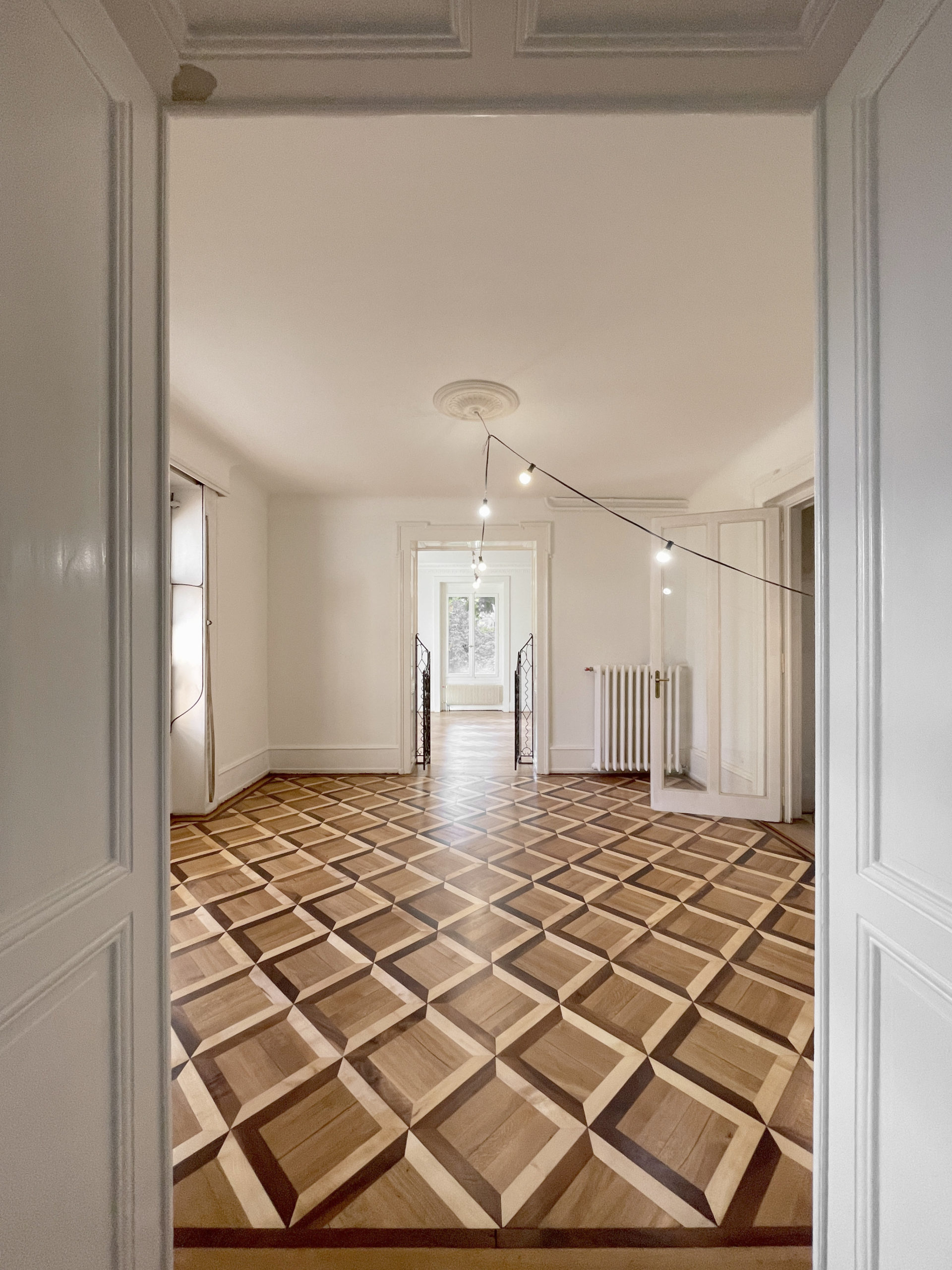Rénovation d’une ancienne villa de style néoclassique datant de 1896, remettant en lumière les anciens parquets et plafonds moulurés, initialement cachés par des interventions successives.